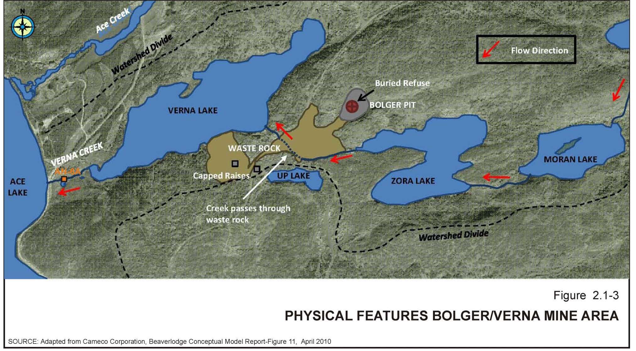 The purpose of the project is to prevent, as much as possible, having water be in contact with the waste rock pile that was placed between Zora and Verna lakes during development of the Bolger pit. As part of the process in assessing potential remedial options for the Beaverlodge properties ahead of the 2013 relicensing process, re-establishment of the Zora Creek channel was considered a cost-effective remedial project. Modelling predicts a significant improvement to the lake water quality in Verna Lake.